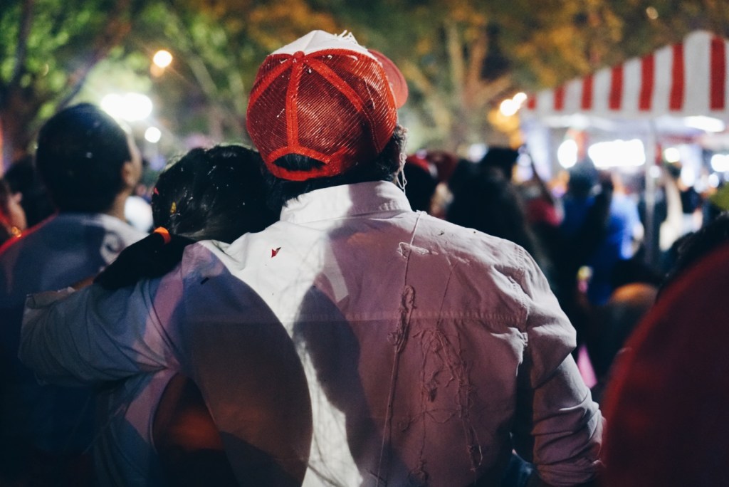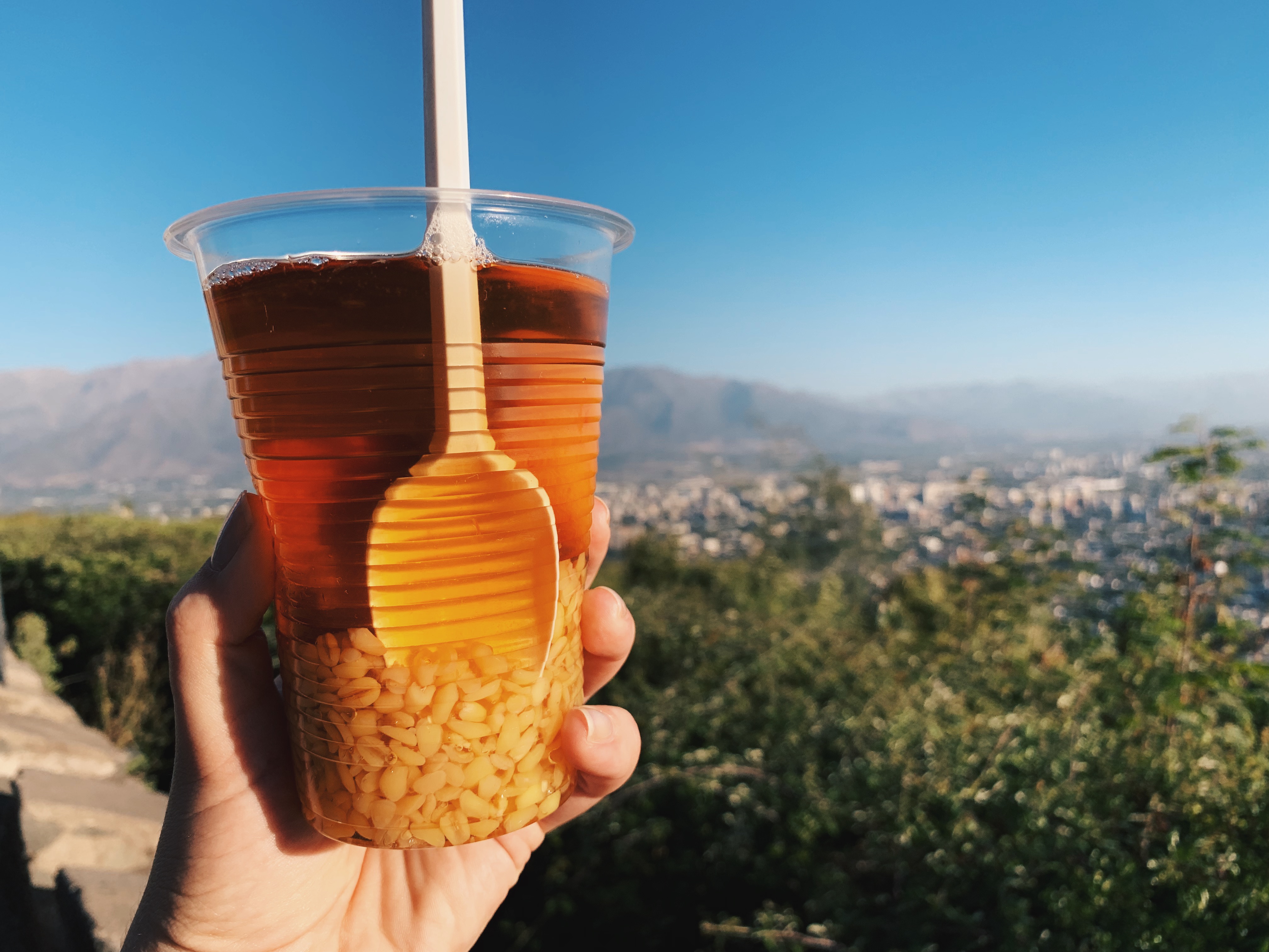 Something that was really cool, though, was as we were waiting for the sunset, families starting piling in. They brought little pop-up tables, chairs, and a little picnic! We regretted not bringing a few cans of beer to enjoy at the top. There was a family that was next to us that had a fantastic spread. Nick was ogling over the brie, saying how much he wanted some. Come to find out – one of the family members spoke English and could probably hear everything we were saying, haha! Everyone was up there to watch the fireworks from above. We were very tempted to stay another 3 hours and catch the fireworks from the birds-eye view, but wanted to get down to La Moneda, near the presidential palace, where they were having a street festival. Another tidbit, I tried my first mote con huesillo, which is a local drink of peach nectar, canned peaches, and grain. It was interesting, and filling. 5 out of 10 rating.