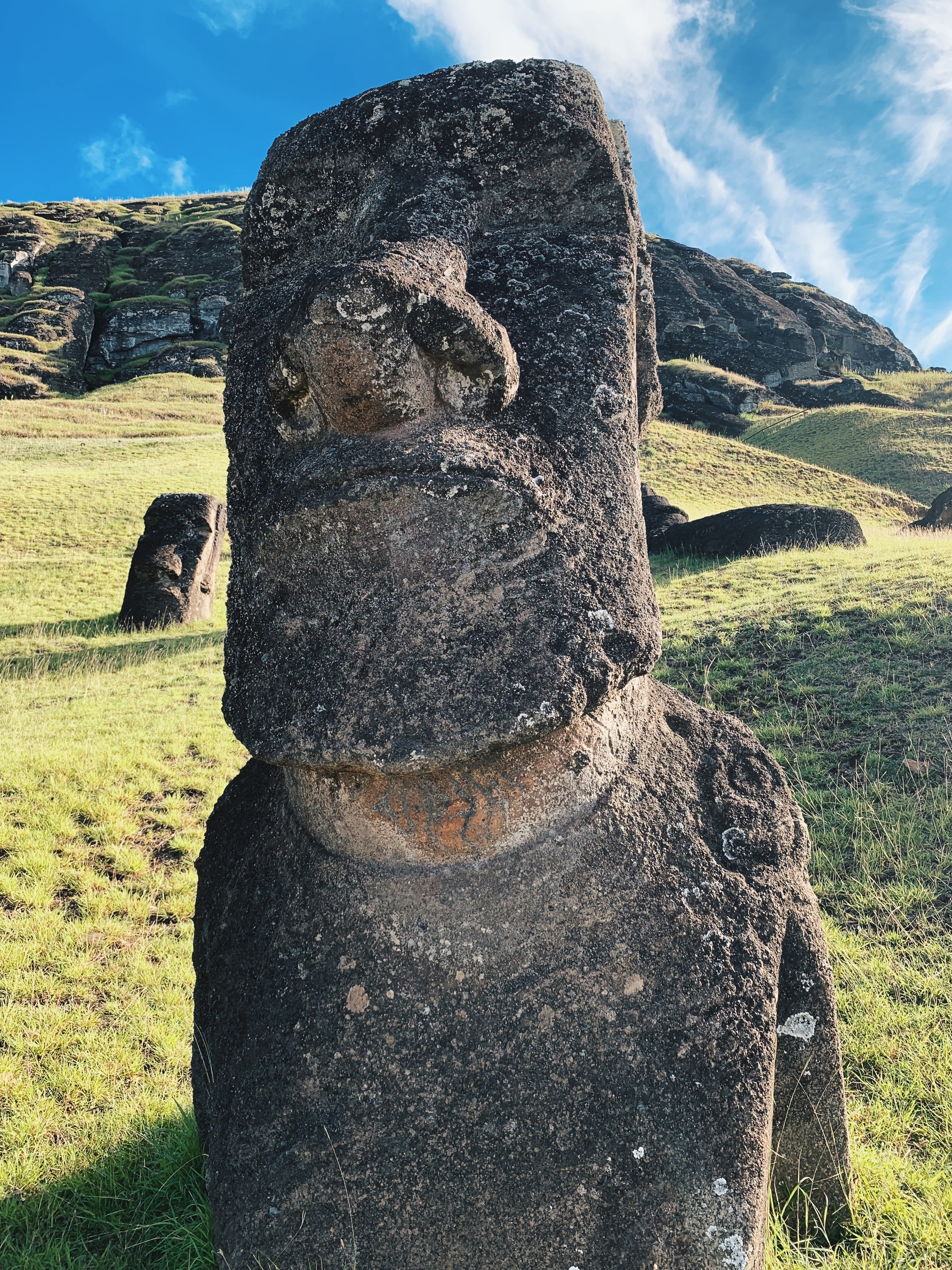 From there, we went to another popular site – Rano Raraku. This was just a couple km’s away from Tongariki and is best known for the quarry where the moai were carved and then carried to other parts of the island. What is soo cool about this site is that it has such a large collection of moai, all of which are in different stages of development. This is the best place to just “walk among” the moai and gain a better understanding and respect for the sheer size. What blew me away was that in many of the pictures, you just see the heads, whereas these are primarily full bodies being carved and the head is about 1/4 the size of the full statue – really incredible. This was probably Sarah and my favorite site on the island.