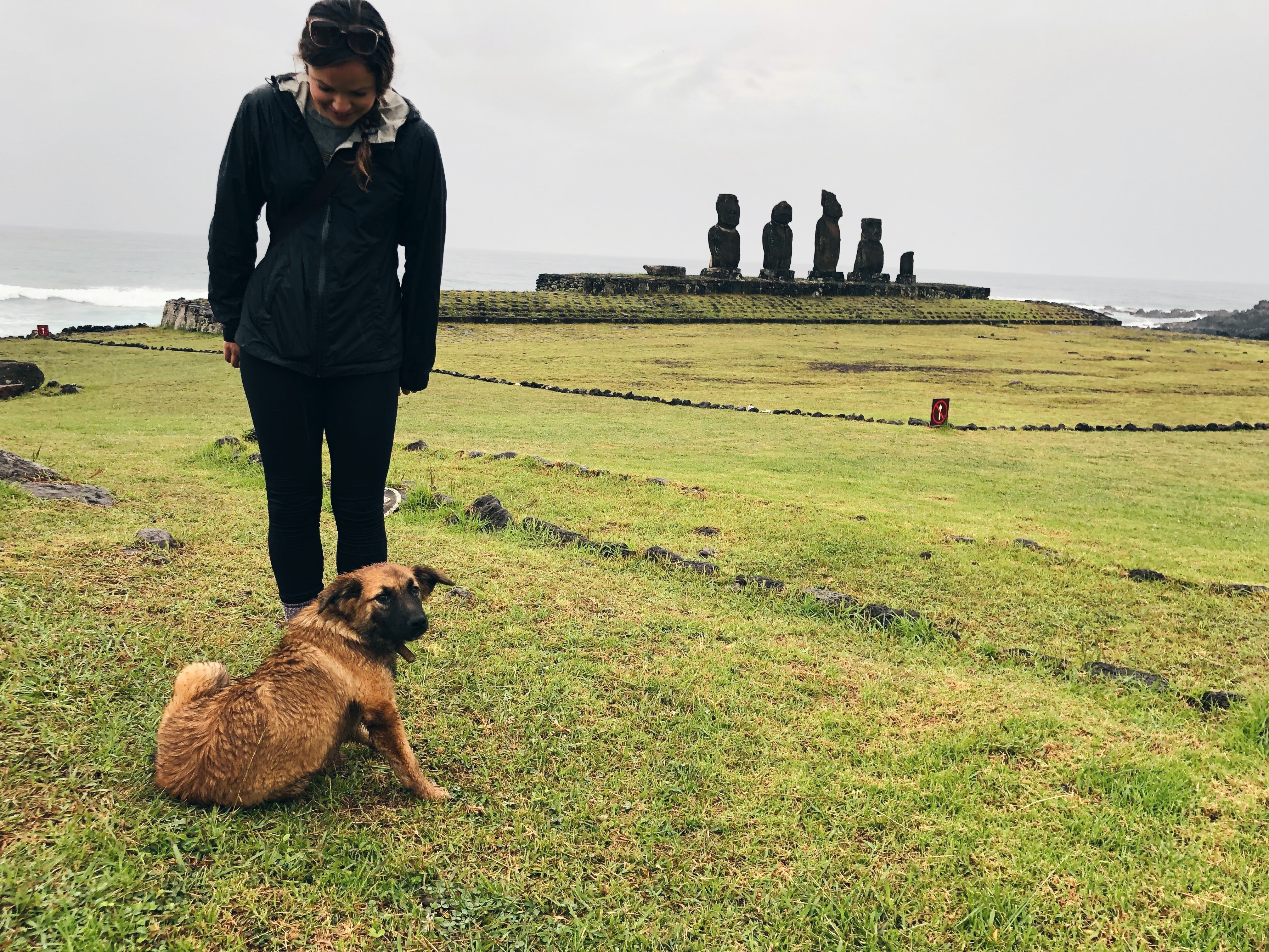 We were definitely spoiled with good weather on Thursday and Friday. Except for a little rain later in the day on Friday, the weather was perfect. Saturday is when the rains became a bit more consistent and the cloud coverage was more noticeable. We had planned to do a hike with Juan Manuel and Mily, but they informed us the night before that they would pass since they were leaving the next day. Therefore, Sarah and I left our Airbnb and walked across downtown to the south of the island to take a trail to Rano Kau (a crater) and the ancient town of Orongo (a town next to the crater). The hike (which was listed as “easy” online) was a bit tougher than expected. It was a straight up-hill hike and our boots were carrying more and more mud due to some of the rains. However, when we got to the top, the views of the crater were fantastic. Additionally, a stray pupper decided to guide us on this hike the entire way, it was a nice extra travel companion.
