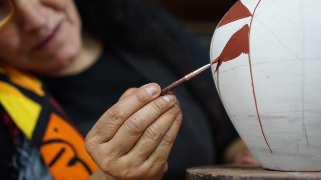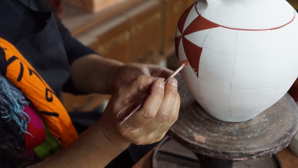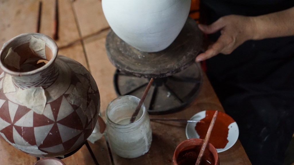 Sandra is a fiery spirit. I really enjoy spending time with her. She’s very passionate about her work and always so spirited when we talk with her. Also, we can understand her Spanish very well, so that helps. She explained during her interview that she makes replicas of original Mapuche ceramic art, many which were used in ceremonies or important events. She was replicating a white and red painted pot the day we talked with her.