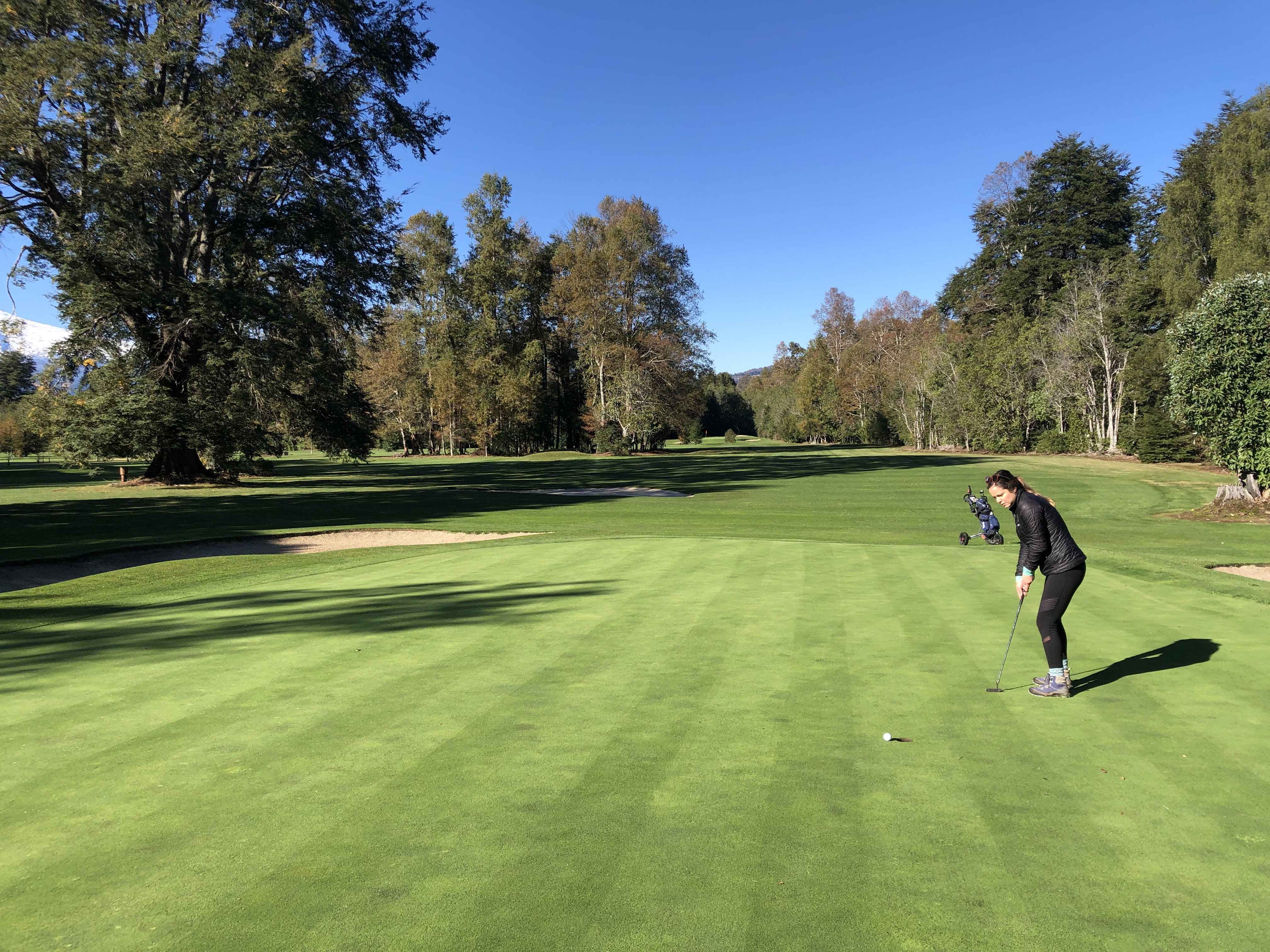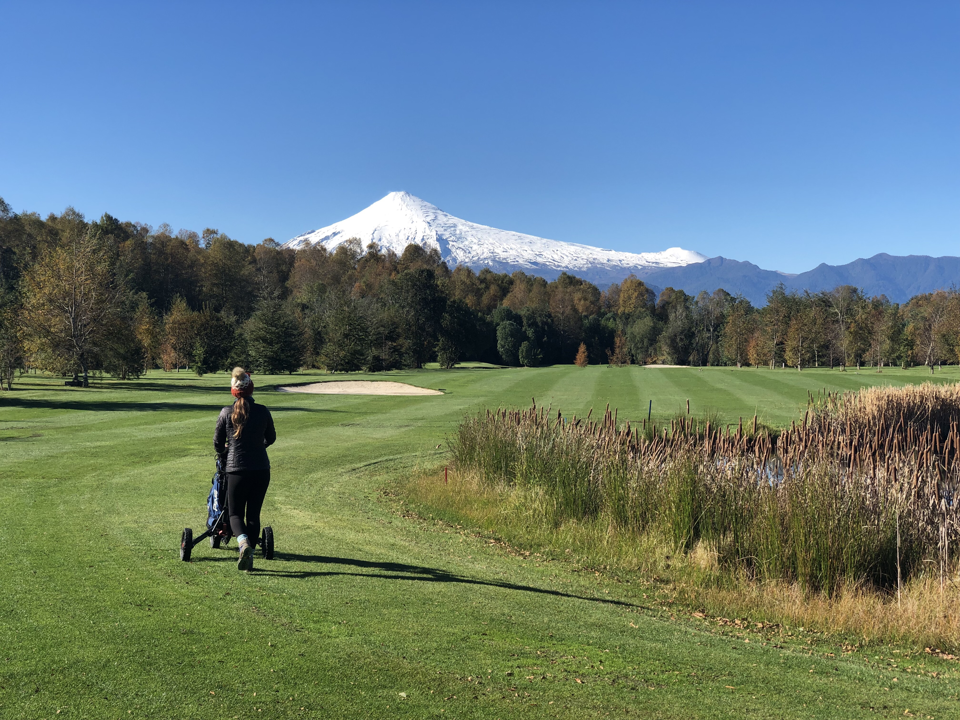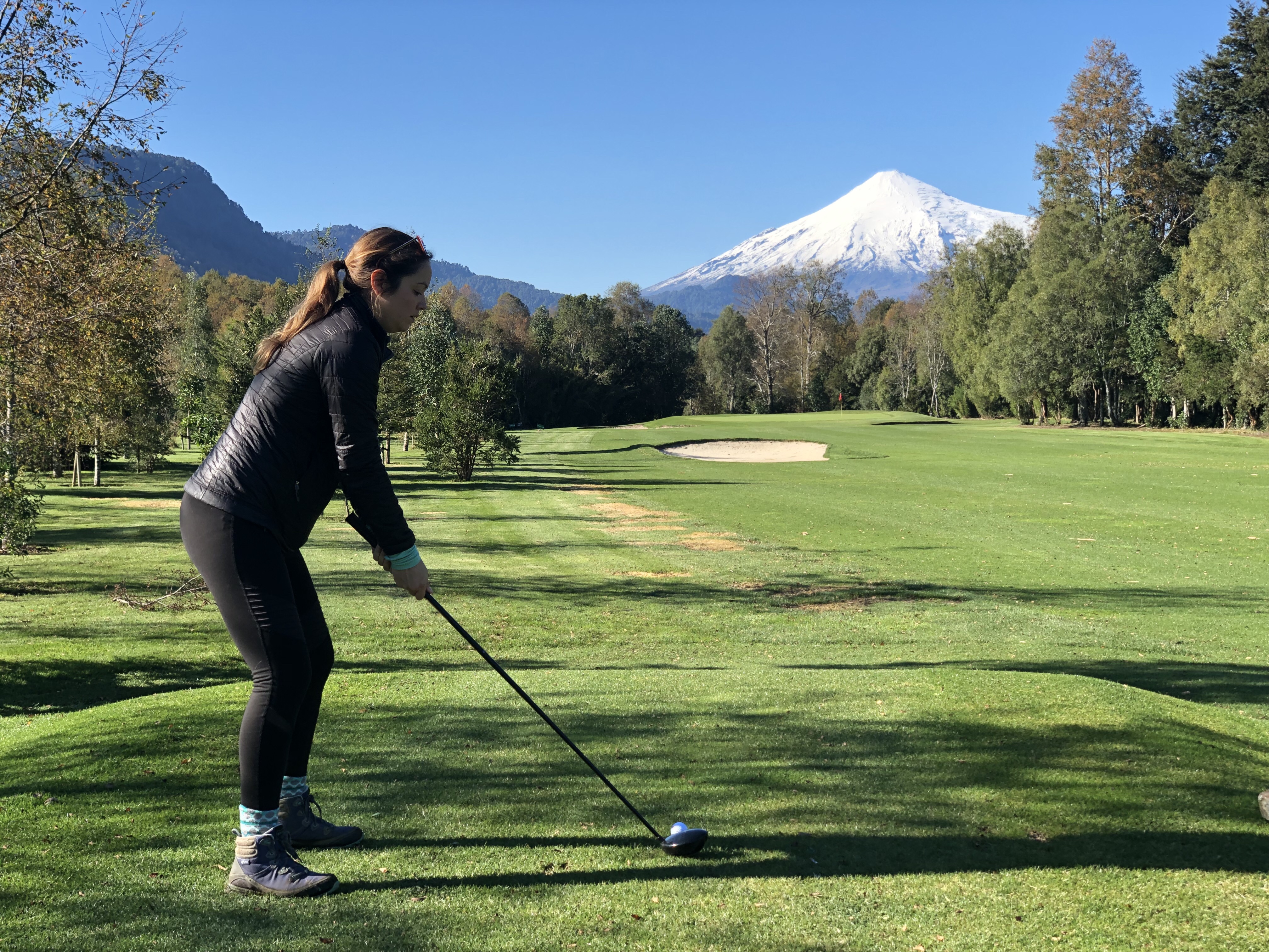 Prior to heading back to Pucon, we wanted to play 9-holes at the Peninsula Course (that I played at back in February). However, as we arrived, we found out that you needed an off-season pass to play, and that the rental clubs weren’t available. Therefore, we googled the nearest course and found one another 45 minutes away that was on our way back to Pucon. We opted for 9-holes there, and had some pretty great views of the volcano in the background. There was no one else on the course, so it was nice to just relax and play some golf (oh, how I miss it).