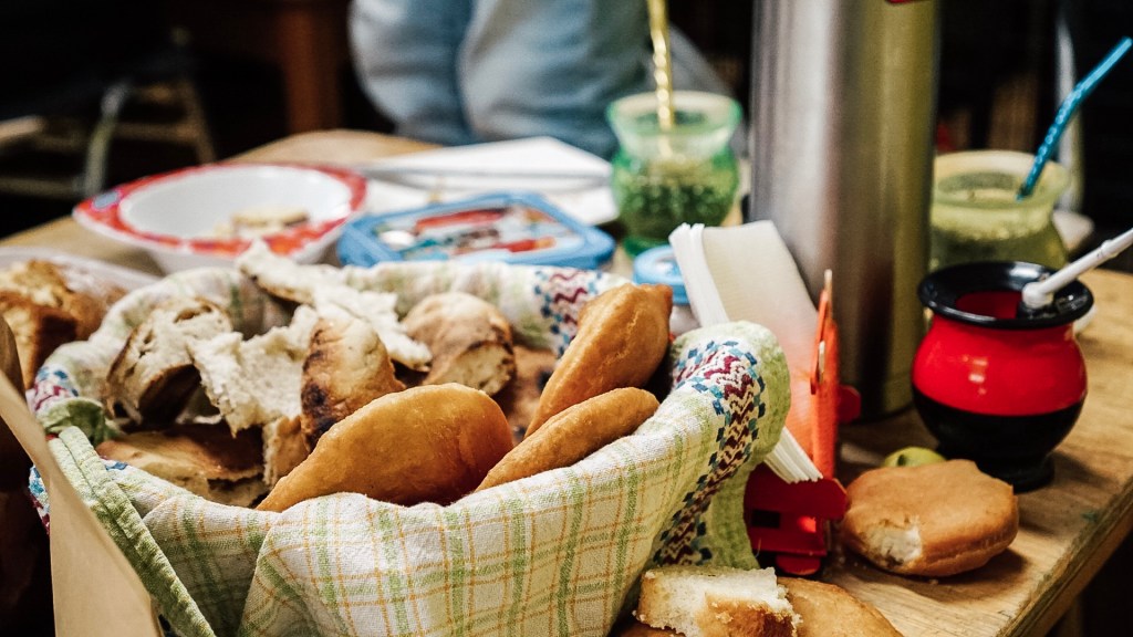 Thursday morning, we met at the museum store and made our way over to the kindergarten. We entered and it was what you would expect at any kindergarten in the world – lots of kids running around! But all of their families were there as well, and everyone was seated around tables sharing traditional Mapuche food of sopaipillas, tortillas (not the kind you would think, more like loaves of bread), and hard-boiled eggs, along with mate, of course! Also, these tables and chairs were kindergarten-sized, so it was quite a sight to see us sit in those (as we’re taller than the average Chilean, especially Nick).